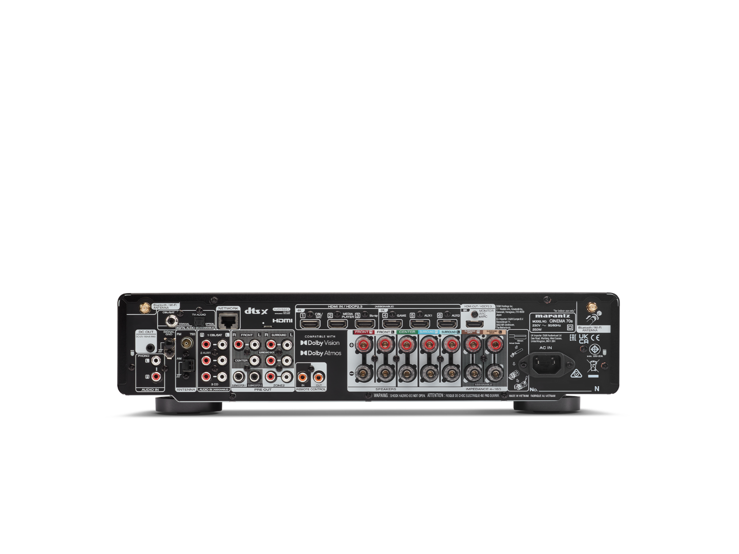 Slimline 7 channel 50-watts-per-channel amplification, Dolby Atmos, DTS:X and 8K Ultra HD, and HEOS streaming built-in. CINEMA 70s appears discreet yet remains a highly capable AV receiver.
